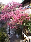 東光院横の六郷用水跡 足踏み水車と菊桃 |